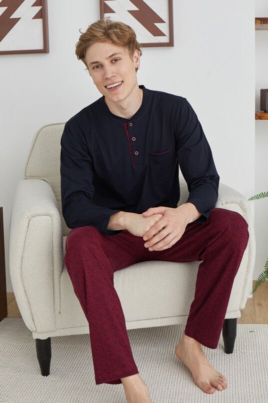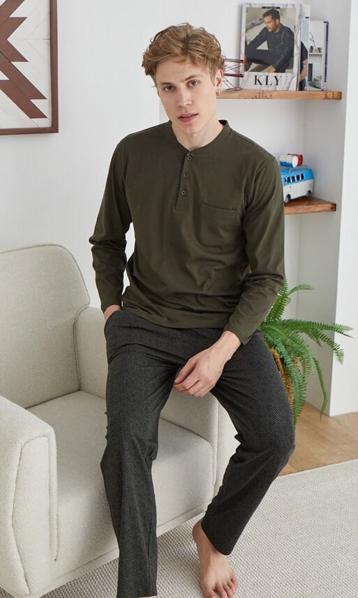 Altı esenli 3 düğme şık pamuklu erkek pijama. Orta kalın kumaş yapısıyla, çok kalın pijamadan hoşlanmayanlar ama sıcağı sevenler için üretilmiştir.