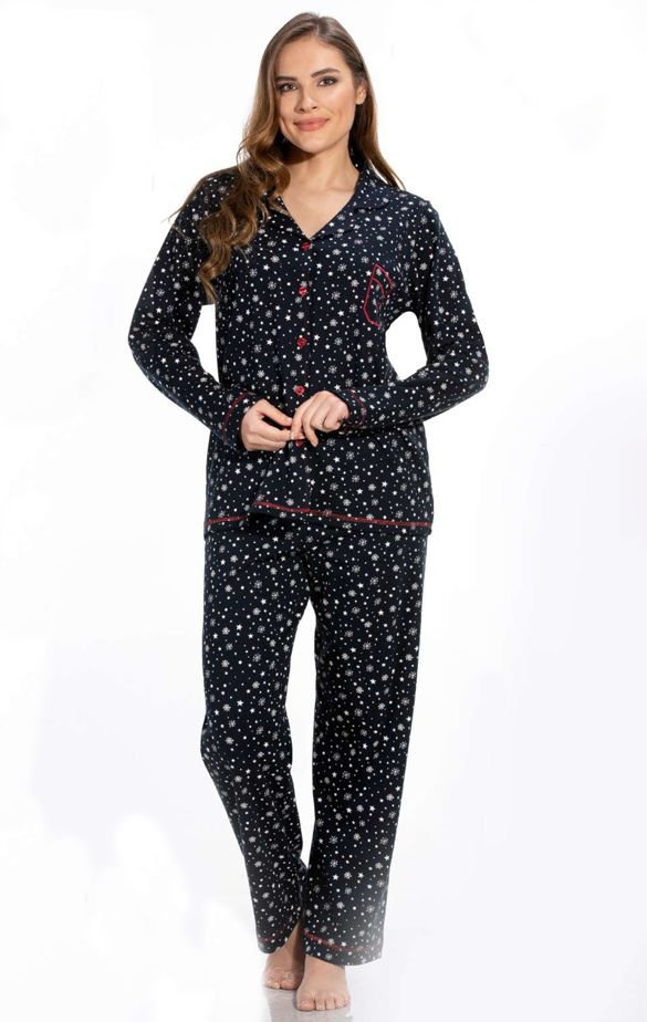 Kar tanesi desenli lacivert, önden tam düğmeli uzun kol kadın pijama.