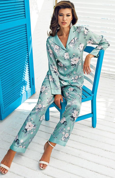 Perin 5404 mint yeşili bahar çiçek desenli saten 4'lü kadın gecelik sabahlık takımın tamamlayıcı özel parçası olarak satışa sunulan Perin 5401 pijama takımı. Rahat kesimi, şık görünümü ile klasik pijama alışkanlığınız değiştirmeye aday bir üründür. Çeyiz alışverişlerinizde ya da günlük kullanım için idealdir.