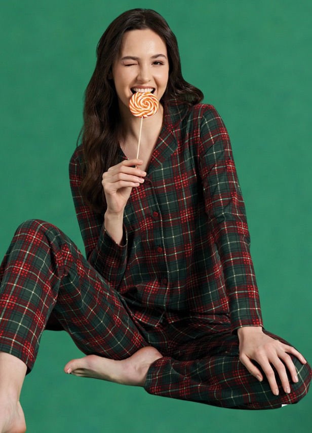 Yumuşak kumaşı, rahat kullanımı ile şık ekoseli tam düğme kadın uzun kol yılbaşı pijaması